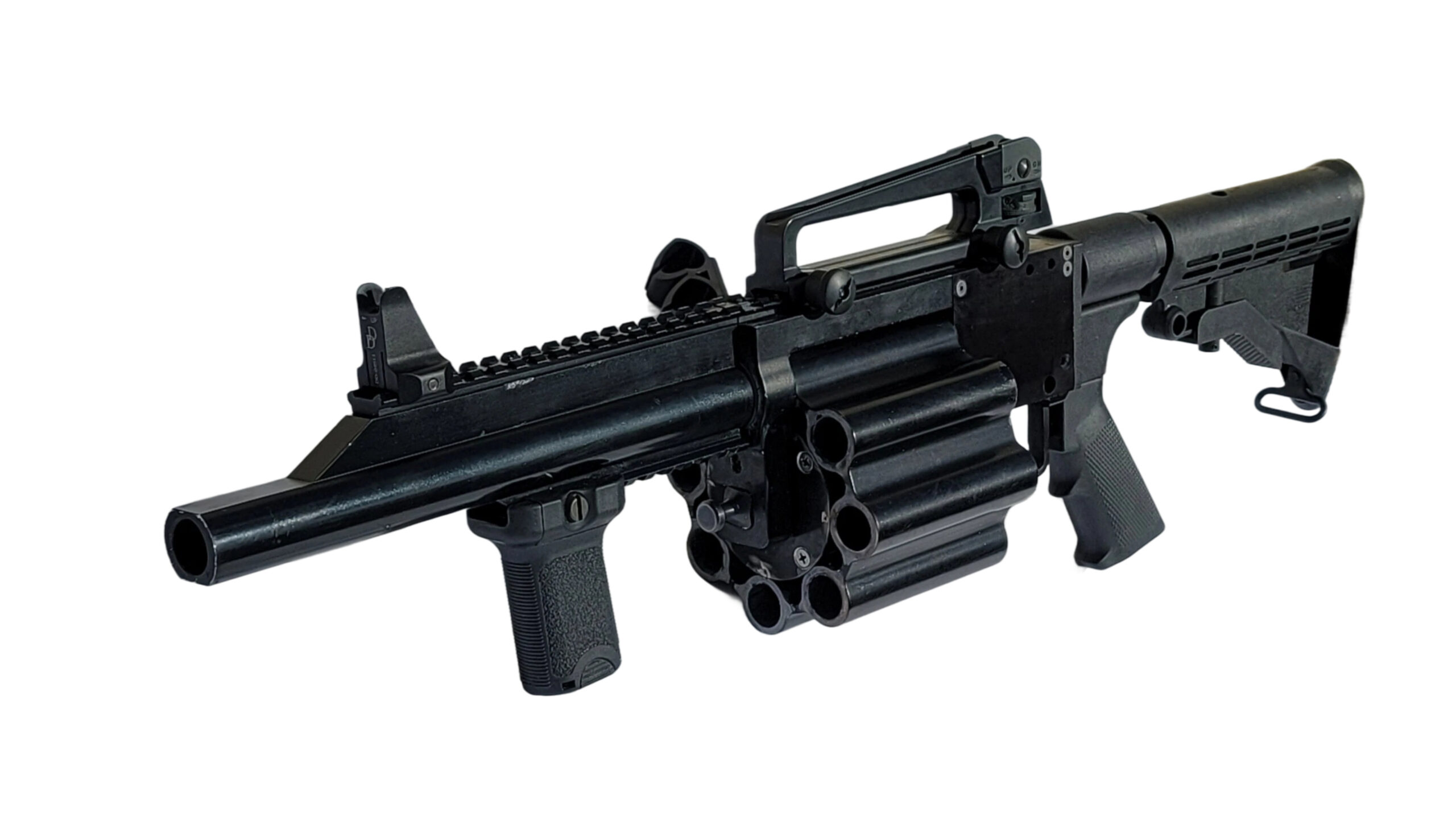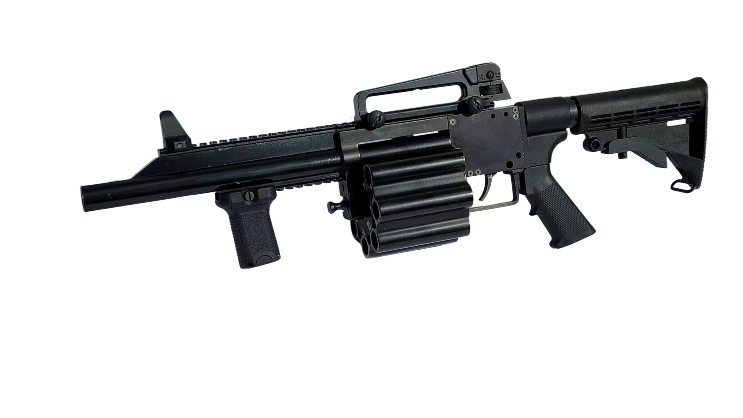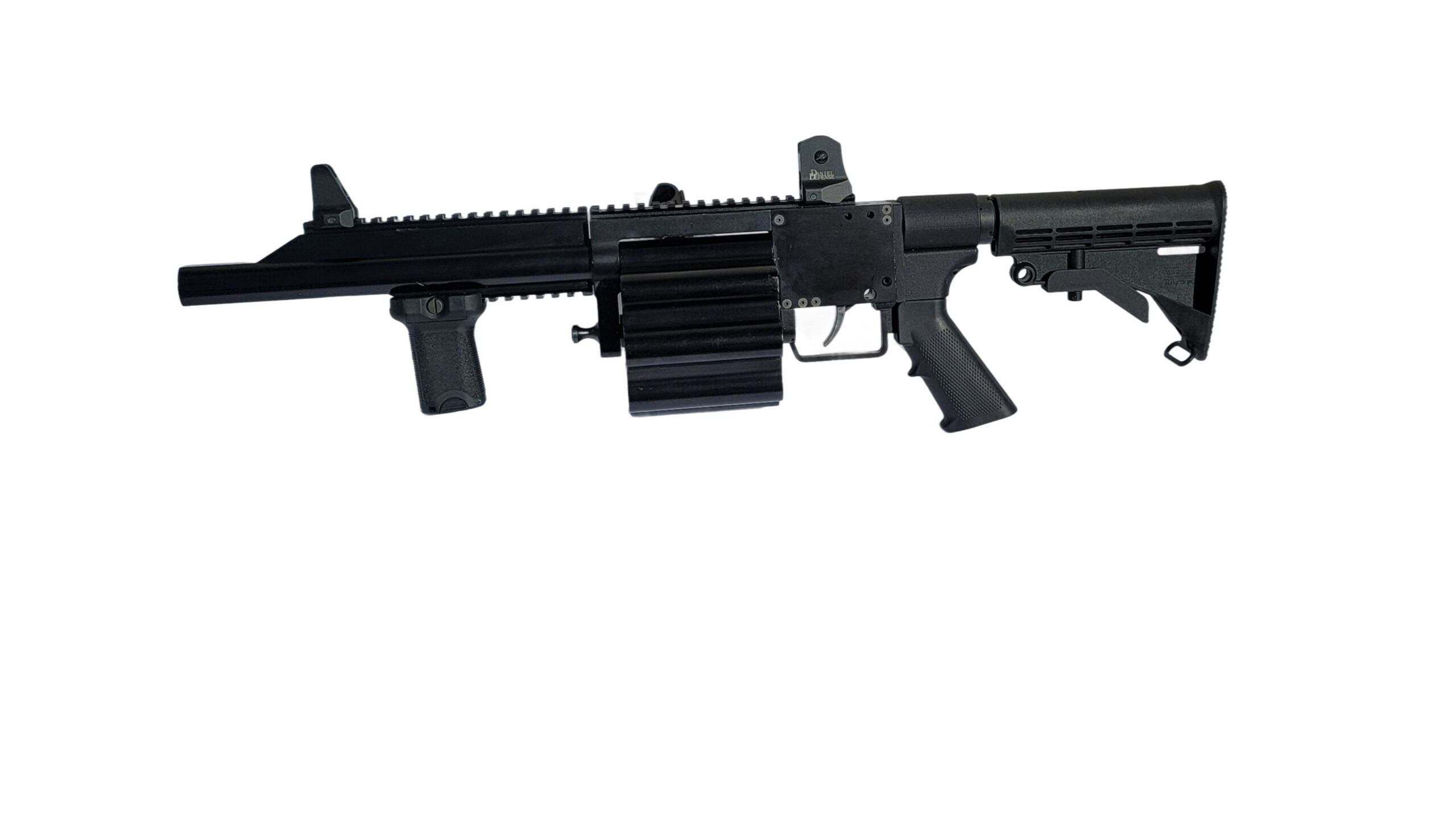 ROTO 12 CS “Chain Saw” Shotgun is a 8-round, 12-gauge, cylinder-fed shotgun that accepts a standard AR15 style grip and AR15 style stock with buffer tube.