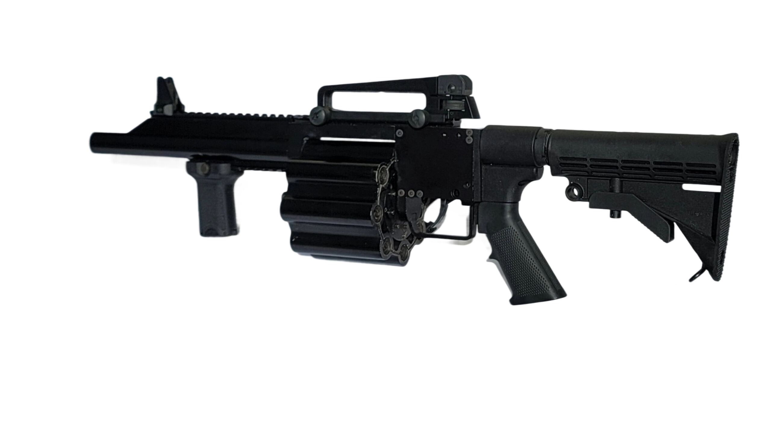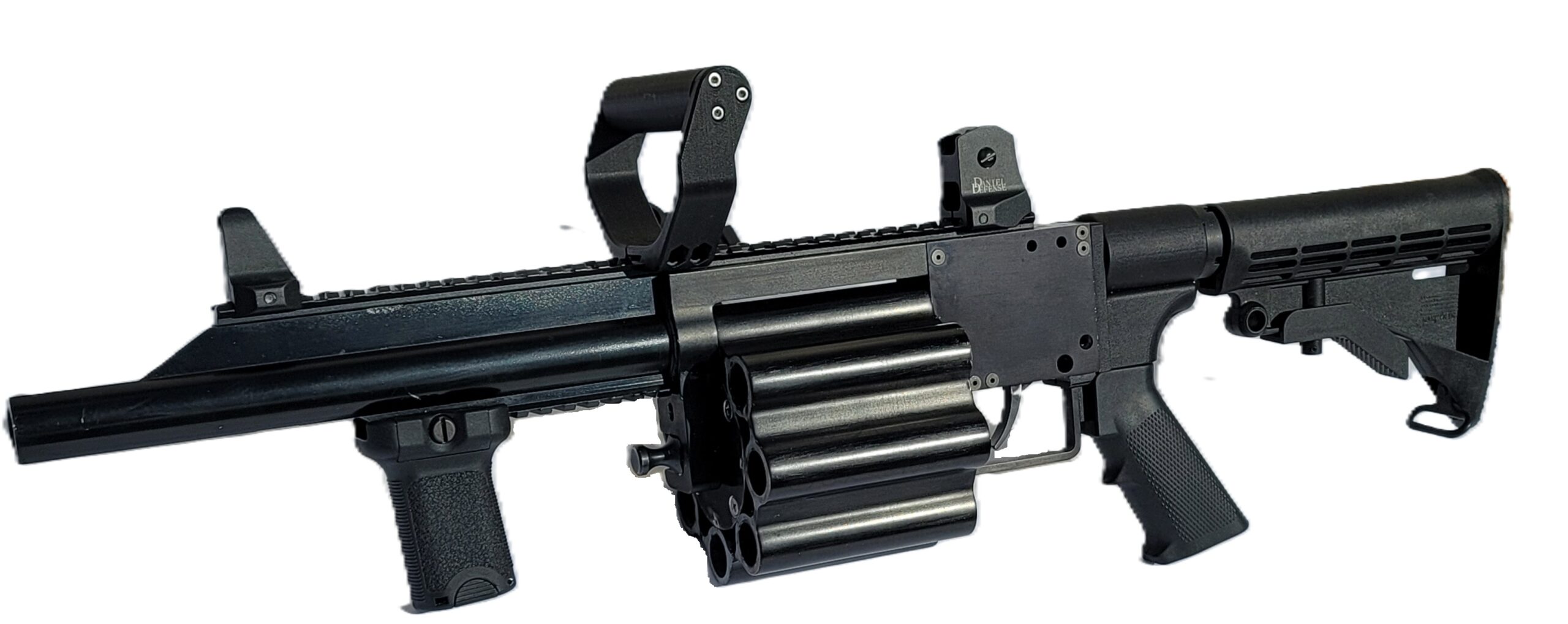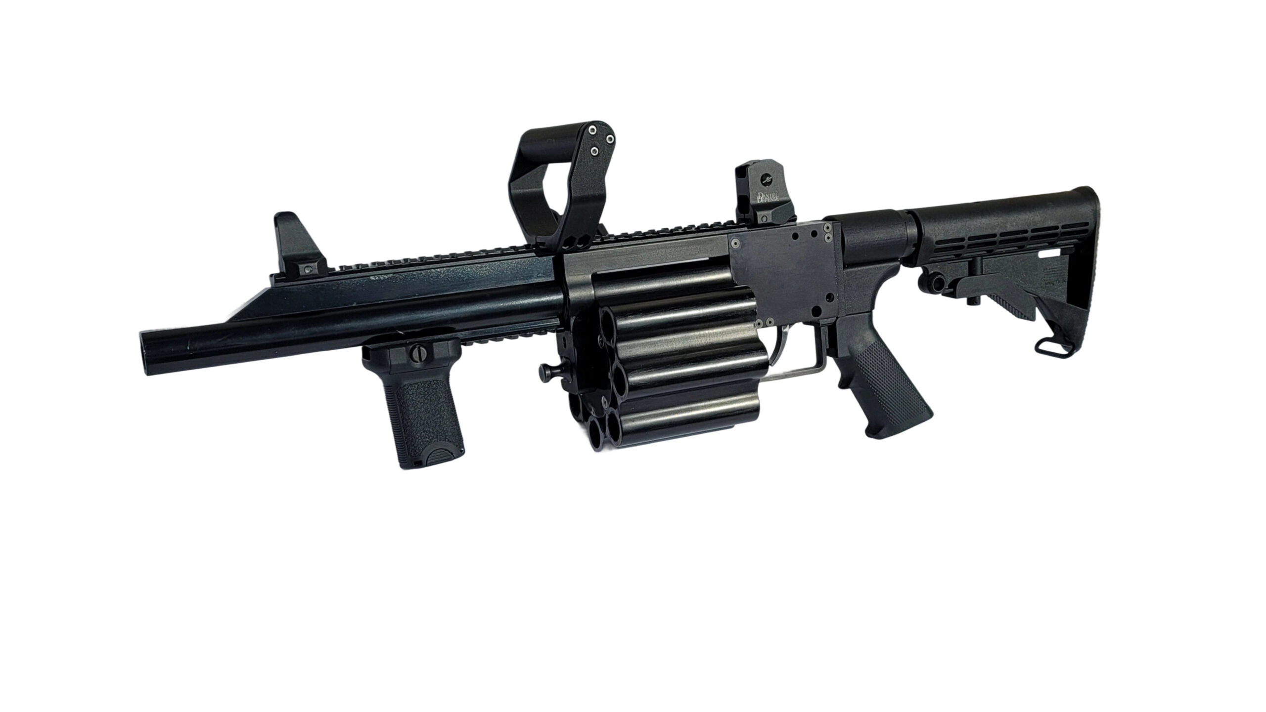 ROTO 12 CS “Chain Saw” Shotgun is a 8-round, 12-gauge, cylinder-fed shotgun that accepts a standard AR15 style grip and AR15 style stock with buffer tube.